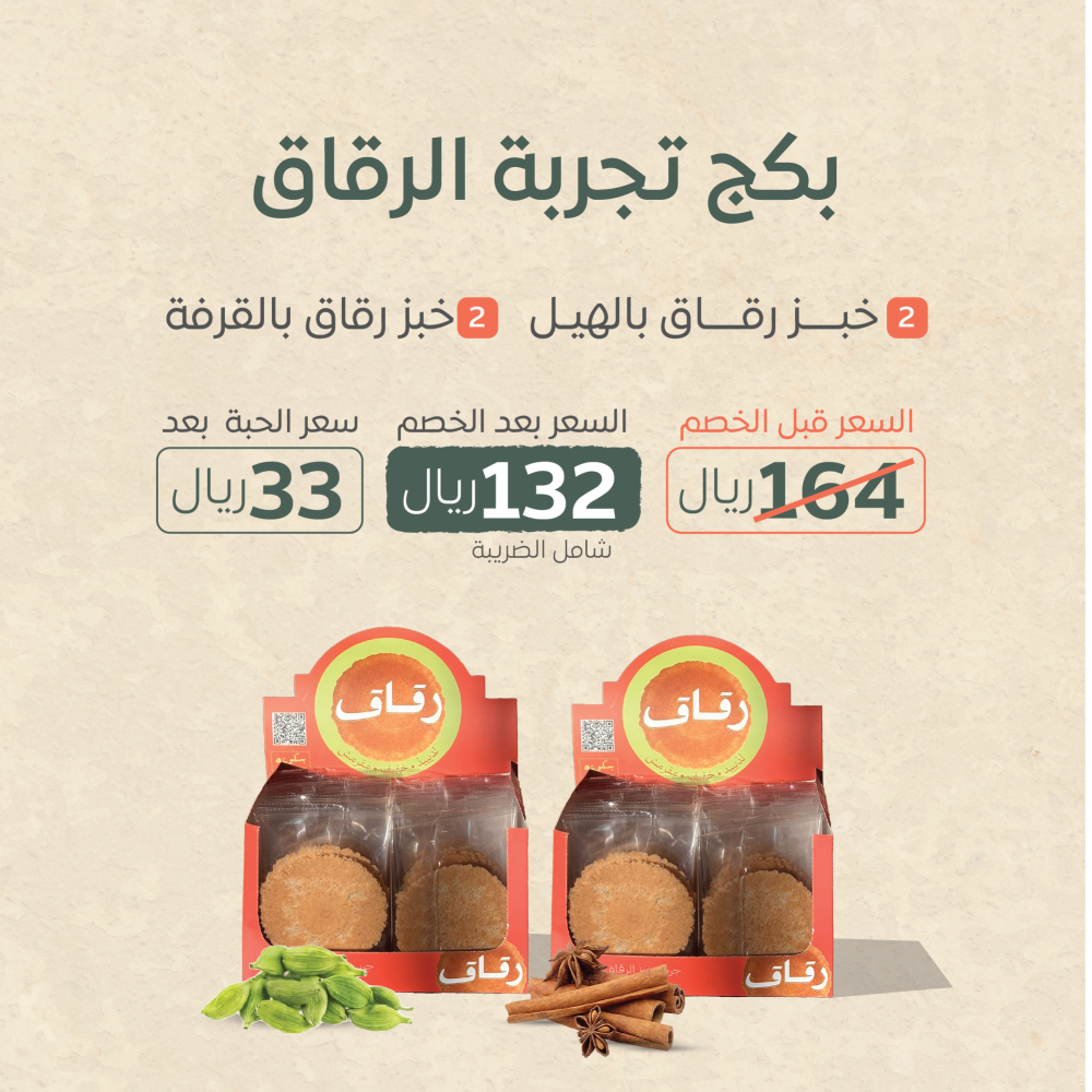 استمتع بتجربة لا تُنسى مع بكج تجربة الرقاق من متجر بسكويته. يجمع هذا البكج بين نكهتين محبوبة من خبز الرقاق: الهيل والقرفة، ليقدم لك توازناً مثالياً بين النكهات العطرية والدافئة. تحضّر جميع المكونات بعناية لضمان جودة عالية ومذاق طازج يليق بمناسباتك أو لحظاتك اليومية.